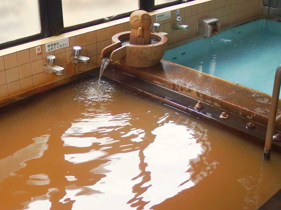 Dark reddish brown hot water has a lot of iron. Hot water is poured from the spout of the cute statue of Jizo-san, and you can relax both physically and mentally.