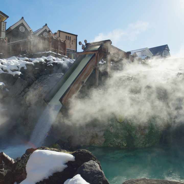 Kusatsu Onsen, which ranks first in the popular onsen rankings, gushes the highest volume of natural hot spring water in Japan (31,582 liters per minute) and has a unique onsen culture. Yubatake, located in the center of Kusatsu, is full of steam and is lit up at night.