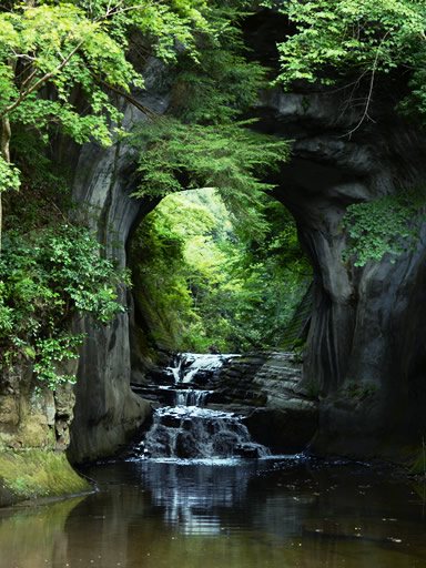 千寿の湯に隣接する清水渓流広場の一番奥まったところにあります。 350年ほど前に、曲がりくねった川をショートカットさせて農地を増やすため、岩盤にトンネルを掘ったことにより、その高低差でできた滝。 光線の加減とかタイミングによっては、神秘的な光景に出会えるかも?(でも川端まで降りるときは、ヒルに注意。)