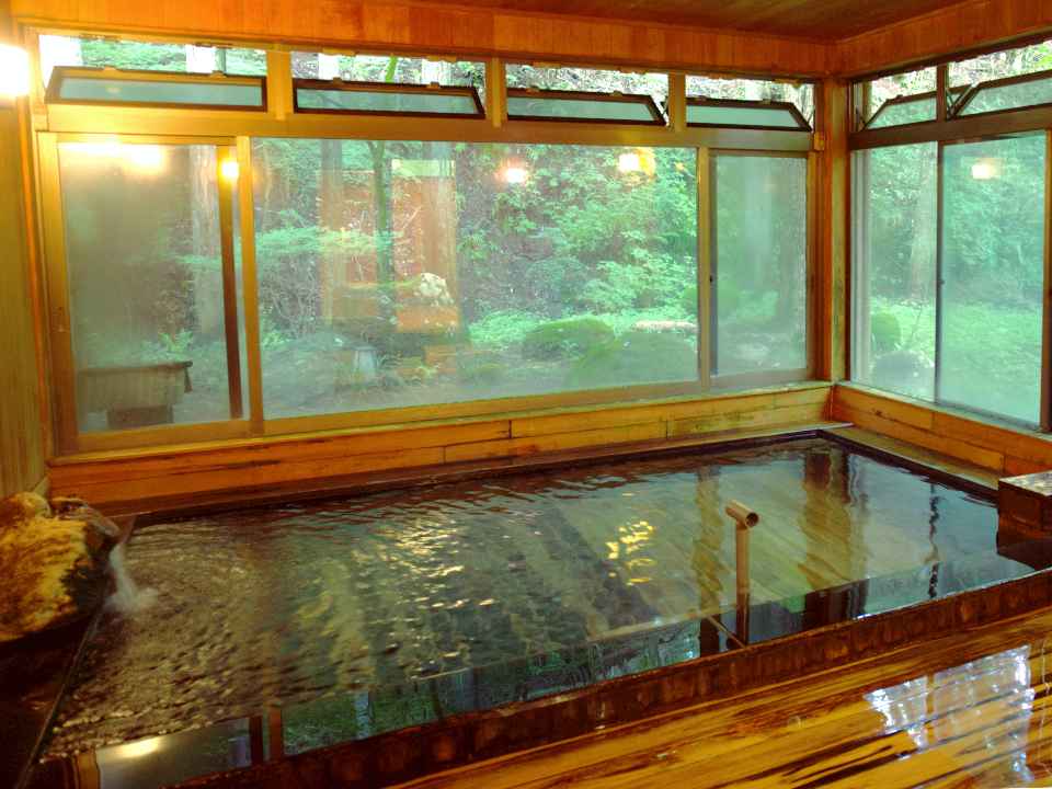 昔から「くすり湯」と呼ばれ賑わったという七沢温泉は、強いアルカリ性で、湯上りにはお肌がすべすべに。 浴室は総ヒノキ造り、大きな窓から森の緑が楽しめる開放感のあるお風呂。