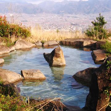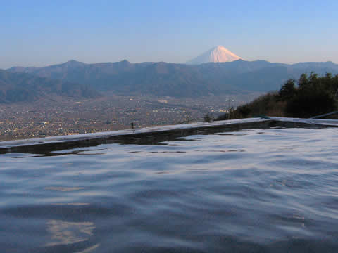 眼下に広がる甲府盆地とその周りの山々、雄大な富士山を眺めながら入る露天風呂の至福
