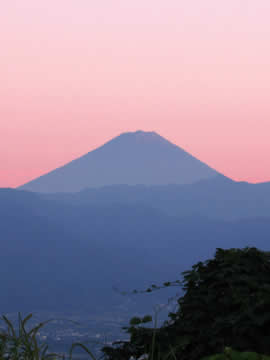 眼下には甲府盆地が広がり、その周りの山々の向こうには富士山を望む、眺望満点の露天風呂。早朝・昼間・夕暮れ・夜景と、時間ごとそれぞれの絶景は、訪れるたびに深い感動を覚える。