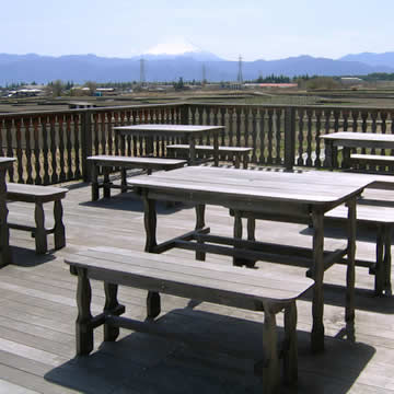 休憩ができる開放的なウッドデッキからは、富士山はもちろん甲府盆地を囲む山々が見渡せる。