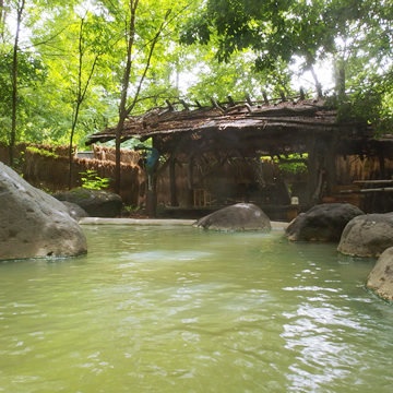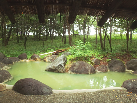 森の中に忽然と現れる縄文時代の野天風呂。緑色に白濁したお湯と八ヶ岳山麓の自然に癒される