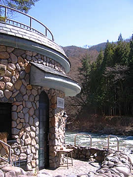 This is a communal bath located almost in the river. It has a unique appearance like a pile of riverbed stones. And the pale lighting inside is making the atmosphere like a cave.