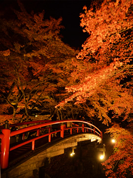 The area around Ikaho Onsen is famous for autumn leaves. In autumn, maples color the mountains, and the autumn leaves are lit up around Kajika Bridge.