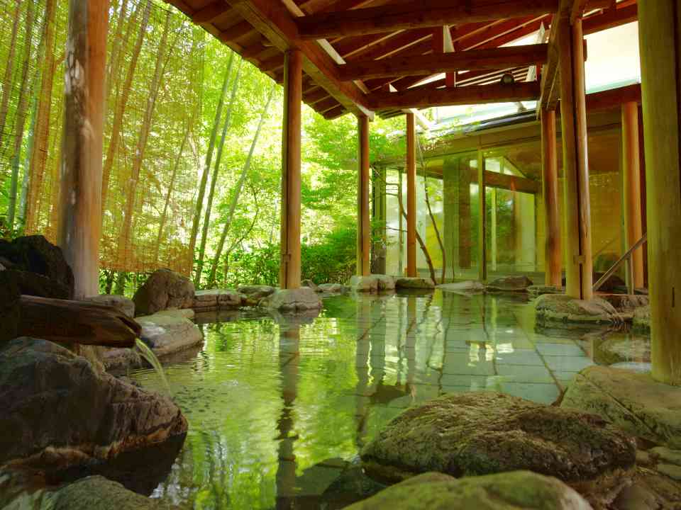 森の木々に囲まれた情緒あふれる露天風呂でゆったり。居心地のよい「日本一きれいな日帰り温泉」