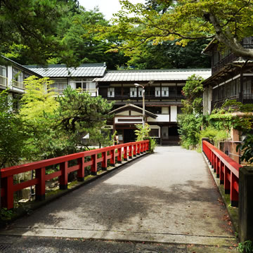 積善館本館は1691年(元禄4年)に建てられた日本最古の湯宿建築。 忠臣蔵(元禄14~15年)の時代の面影を今に残す重要文化財。 また、本館の前にかかる橋は「千と千尋の神隠し」に登場する赤い橋のモデルと言われている。