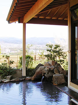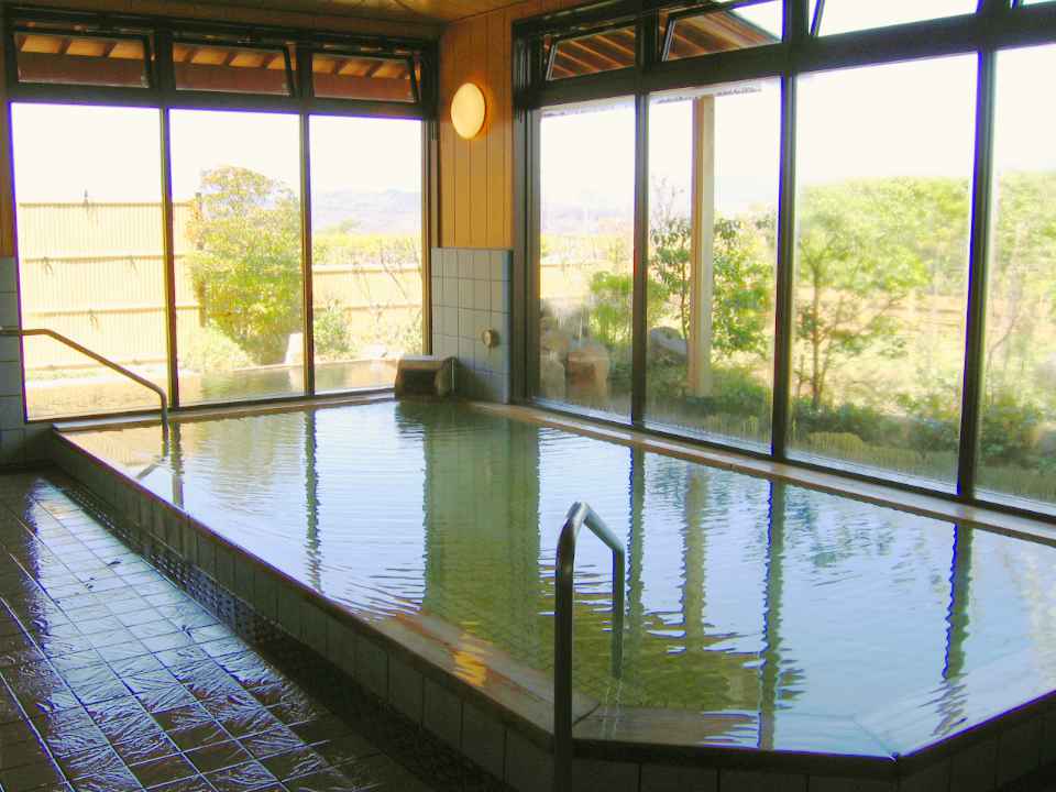 2面が大きな窓になっている内湯は、光がふんだんに降り注ぎ、明るく清潔感がある。露天風呂からは八ヶ岳、茅ヶ岳などが望める。