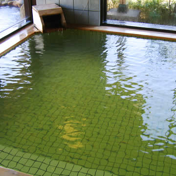 うっすら緑色を帯びたお湯が、とうとうとかけ流される湯船は、輝くようなうぐいす色。その中を無数の湯の花が舞う。