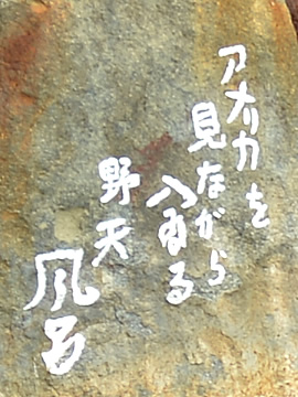 ん? 岩になんか書いてある。『アメリカを見ながら入る野天風呂』か…。いやいやいや、見えないでしょう!