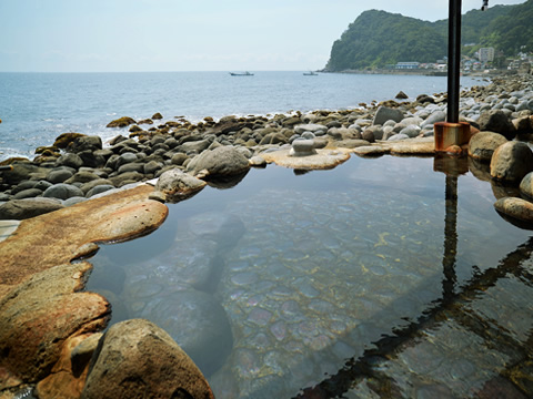 波打ち際にある露天風呂。 目線の高さが海面とあまり変わらないので、大海原に浸かっているような感覚に。 全国の温泉ファンが絶賛し、日本経済新聞による「大自然につかる絶景温泉10選」にランクインするほど。